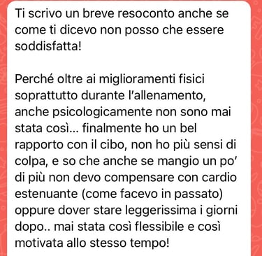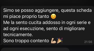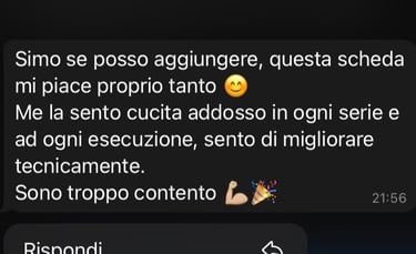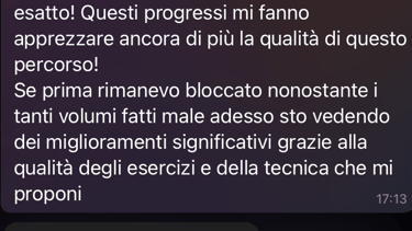 Contatto diretto con il coach tramite chat dedicata, per un continuo confronto e aggiornamento. Invierai settimanalmente i video dell'esecuzione degli esercizi che serviranno, per ricevere le correzioni e le progressioni ogni qual volta che ti allenerai o che ce ne sarà bisogno, questo per permetterti di progredire in sicurezza